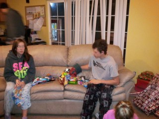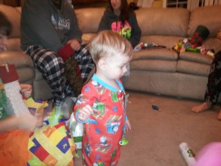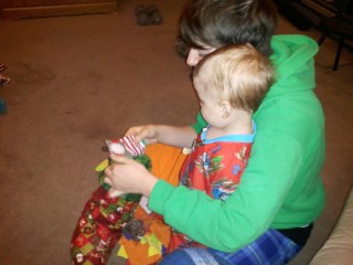 On Christmas morning Kimber, Ray and Ben arrived at 6 in the morning. They wanted to get to the Jessop’s house by 8am. Jon was calling. Kimber was the most excited. She came running in and turned on the Christmas music. Then she jumped on everyone and made them get up. One by one people filed into the family room to open stockings. There were many squeals of delight from Lillian. Everyone else was pretty stoic. Chad realized that there was plenty of time to open presents before Jon called. So the present opening commenced. Ben didn’t get it at first. Kimber had to help him. After he ripped open his first toy he got distracted with playing and she had to help him some more.