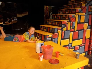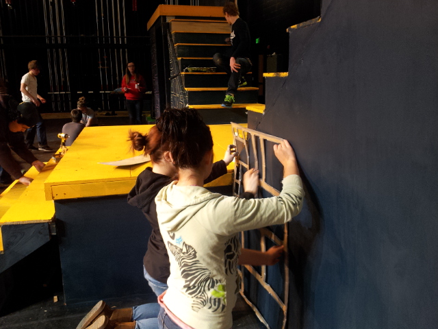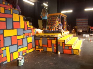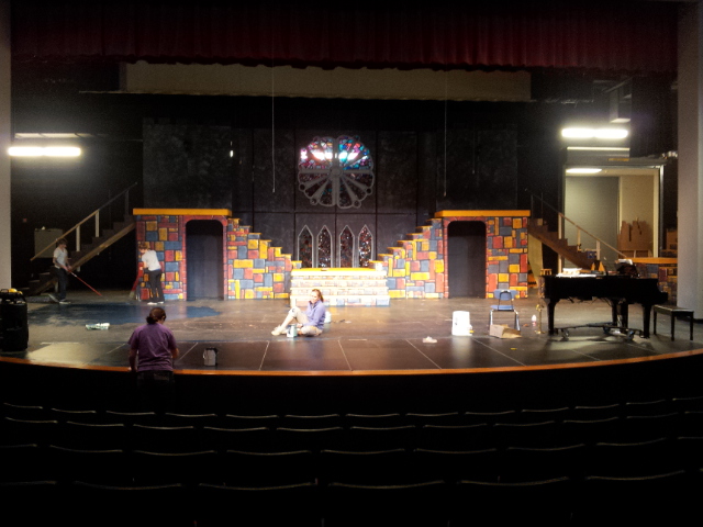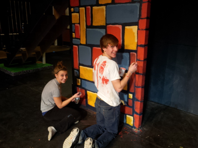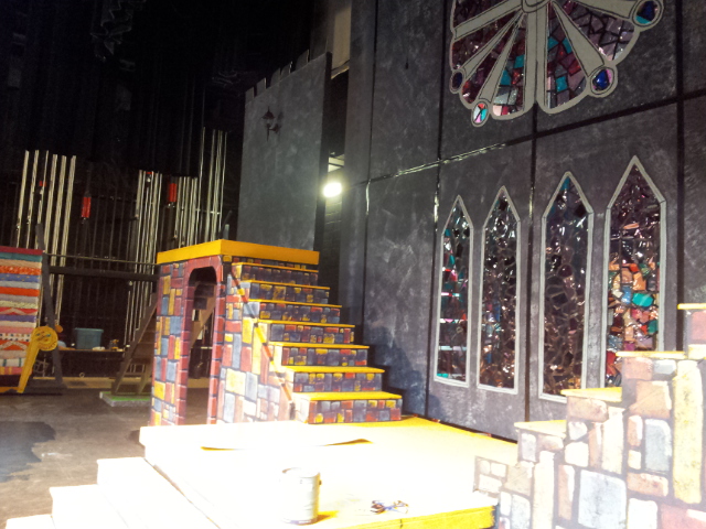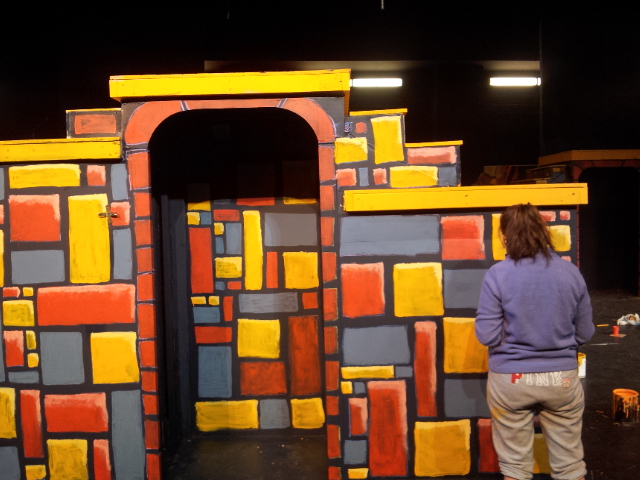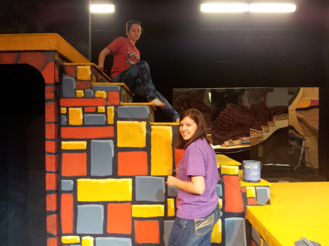 Saturday was spent on Once Upon a Mattress set. It was a big painting day. I had the girls use a temp-let and mark out all the bricks.
