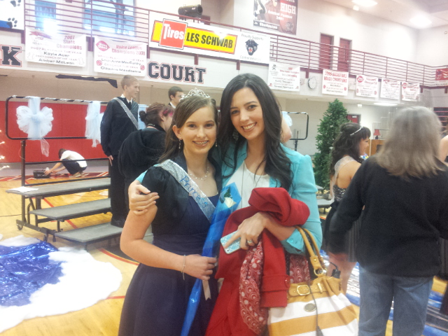 This week has been a ROYAL week. Remember how I said Hannah was elected as the Freshman Princesses for Snowball? Well, Friday there was a big assembly where she got to walk down the stairs to music and everything. My phone camera isn’t the best so I didn’t get a picture of her walking down the stairs to Fix You by Exit 245. Trust me. She was a vision of poise as she glided down the stairs. I wanted her to come down to Can’t Touch This by MC Hammer. I was vetoed.