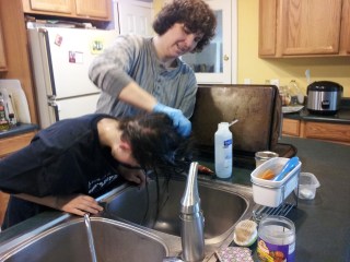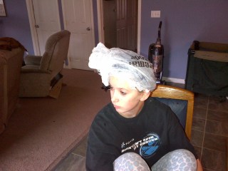 Friday, Hannah missed most of school. First, she had a ortho appointment to adjust her braces. Then, since I didn’t have time to take her home, she went to Portland with me for my acupuncture appointment. On our way home we stopped to look for extensions and hair dye to make it all match. We didn’t have time to dye her hair on Friday, but we planned on doing it Saturday morning before the Matinee.
