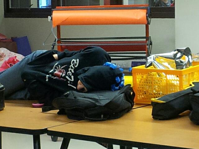Working at the HS also gives me the opportunity to see what my children are up to at the school. This is what I found on Thursday morning… Chad sleeping on the tables in the ASBEC room… with a new hair do. LOL. He has choir 0 hour and then nothing 1st period. He then has choir again 2nd period. He often will sleep for the hour he is waiting. Lately, Mr Witt has been called into meetings 1st period and the students are just given free time. On this particular morning a couple girls decided to add blue tape hair to Chad while he slept. It cracks me up. I never heard what Chad thought when he woke up. I do know that the girls were very proud of themselves.