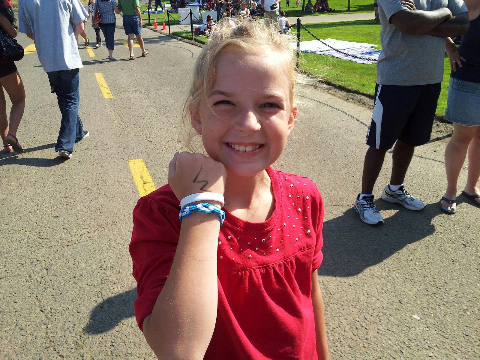 | Lilli got a braclet at the fair in the park |