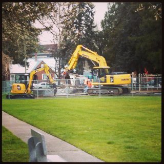 Last week saw the end of an era. The fountain in the center of town was removed. Sad. My kids spent many summer days romping in the water and dancing around the fountain during summer concerts in the park or afternoons gatherings. I have no idea how old the fountain was. I have no idea why it was removed. I do know that times change. When we moved here there was a giant slide, large swings, and a merry-go-round. Slowly, one-by-one, each of these former icons of American parks have disappeared. I blame lawyers. In a few generation slides and swings may be extinct. All those fun things I used to play with will be gone. At least they are replacing it with a splash pad and some other new expensive water feature.