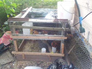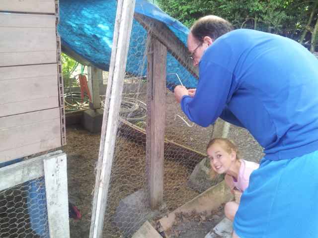 John and Lilli moved the baby chickens out of the garage. Thank heavens! Their stench was starting to creep into my house through the laundry room! They started by moving the babies and their pen next to the chicken coop so that all the chickens could see each other through the fence and become friends. that was for a week. Then, they hung carrots in the coop so that the old chickens would have something to distract them and moved the babies into the coop. The idea was to get the big chicken not to peck the little chicken to death. It didn’t work. The big chicken kept the little chicken in the corner and they could get food or water.