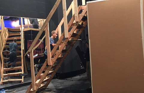 As I looked at my stock stairs and the narrow “backstage” area I needed them to sit in, I realized it was time to invest in a “new” stock item. I needed something that could be flexible as escape stairs… anywhere from 3 feet high to 10 feet high… time to build ship stairs. I had used them in college, for ever ago, and had to rake my brain as to how we built those.
