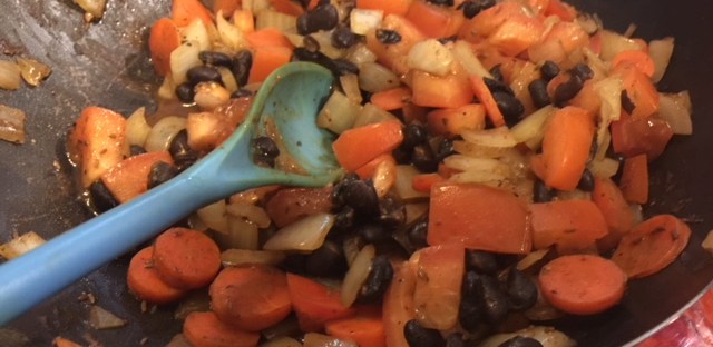 - Saute beans, carrots, and onions for 5 minutes.