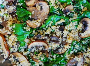 This puts dinner on the table in 25 minutes. It’s a great savory way to eat mushrooms, onions, and spinach.