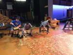I use flat paint. In this case, we rolled on chairs to cover our massive floor space. Each “chair” had a different color to apply.