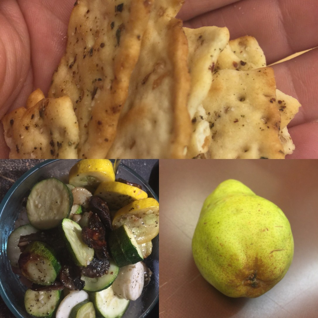 The next day I had sautéed veggies, a few crackers and a pear for lunch. I had more left over chili for dinner. Oops. I forgot to take a picture.