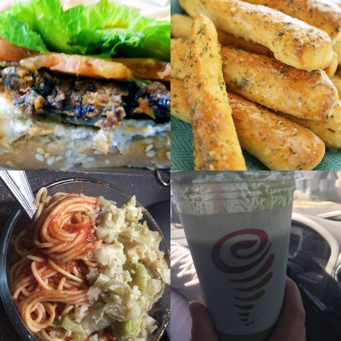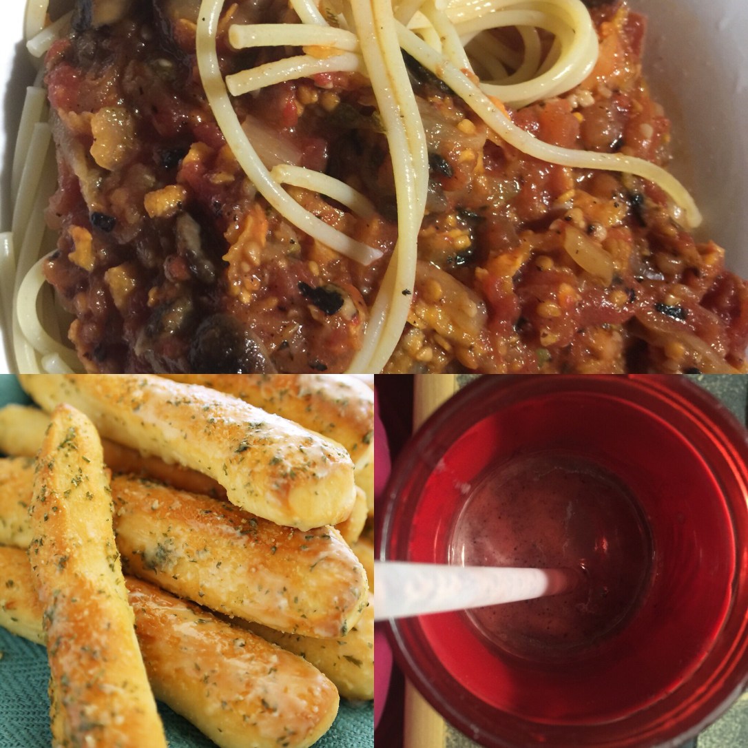 The next day I took my daughter to Jamba Juice because we had an appointment in Salem. I also had a veggie burger for lunch with her. For dinner I made spaghetti and finished off the cabbage dish and the last of the breadsticks.