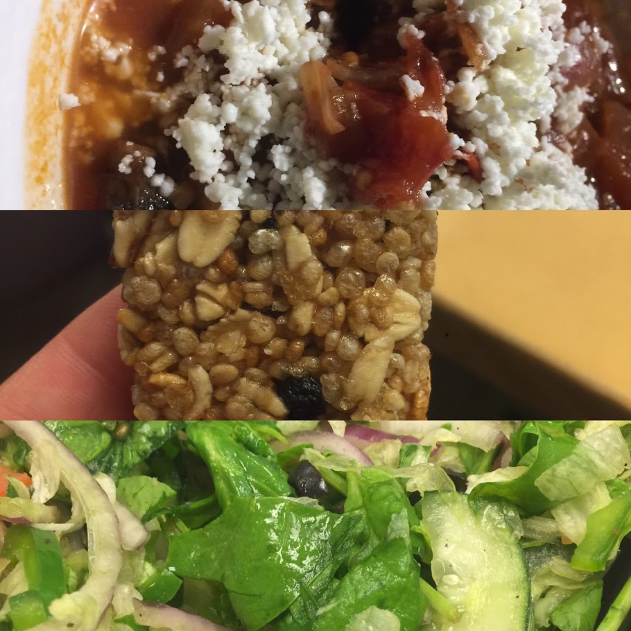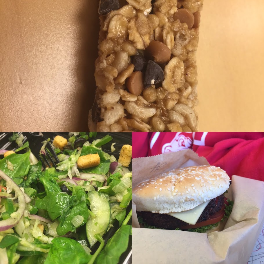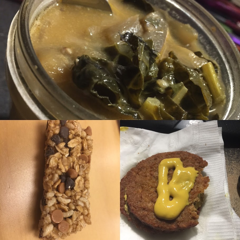 Monday I didn’t have much to choose from because we had not gone grocery shopping for the family as we were gone for the weekend. I ended up eating Miso veggie soup, a granola bar I found at school and a veggie burger with mustard.