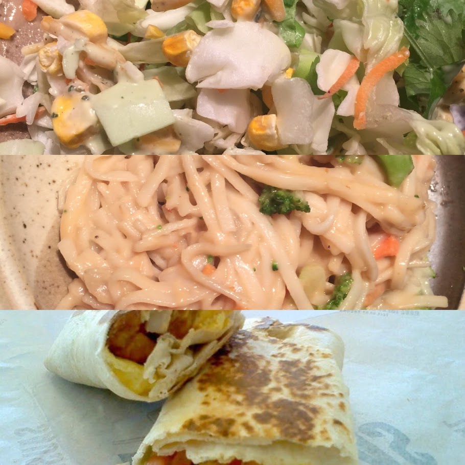 These were my choices a couple of Mondays ago. I had a nice fruit shake and some crackers for lunch and a nice salad and pasta with marinara sauce and vegan cheese for dinner.