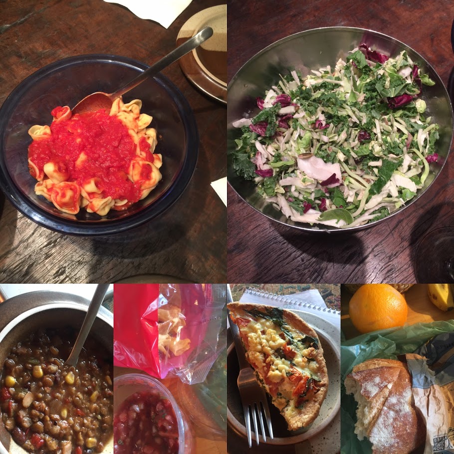 Sunday, I admit, I went a little crazy. I don’t usually eat breakfast, but Sunday I ate some of the veggie quiche John made. Then we snacked on chips and salsa, sour dough bread and sugar free jam. For lunch we had a lentil soup. At dinner time we made a tortellini with a yummy marinara sauce and kale salad.