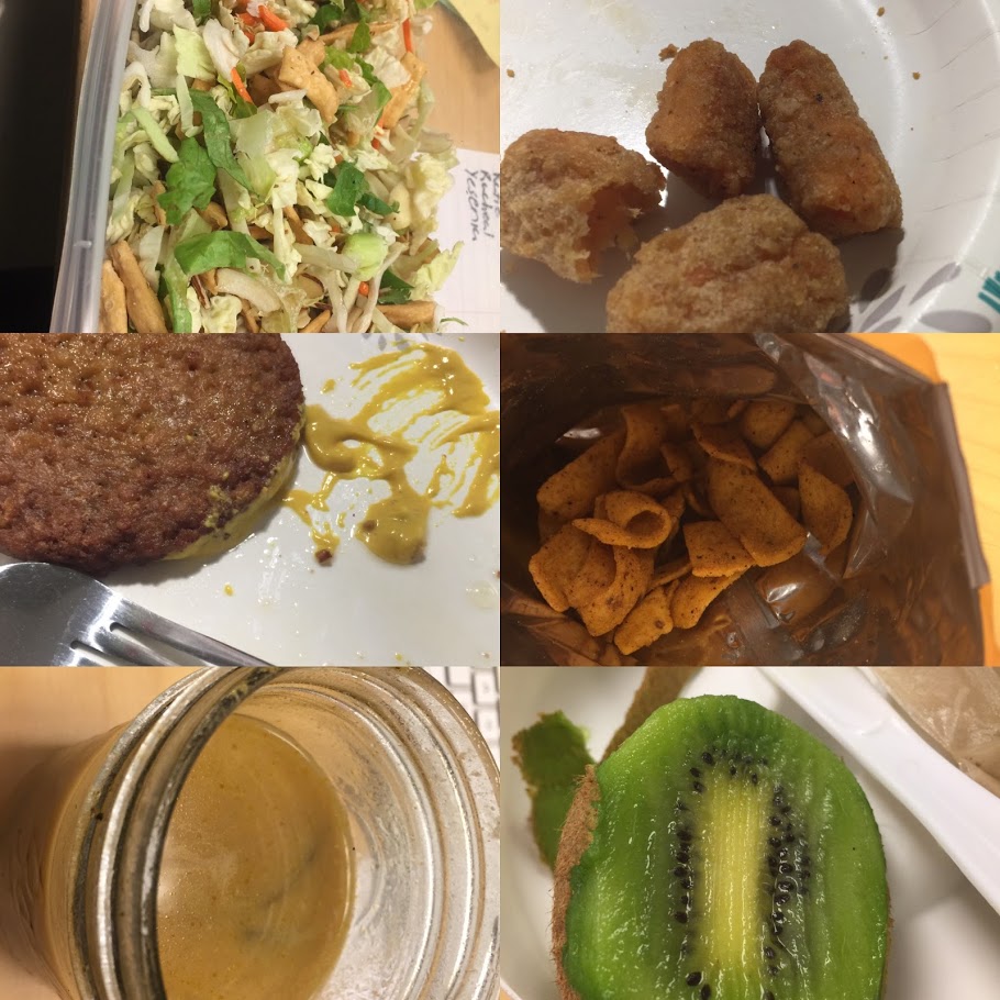 Thursday I had some corn chips, a kiwi, a salad and some Miso soup while I was at school. Once I got home I ate a veggie burger with mustard and a few sweet potato tots.