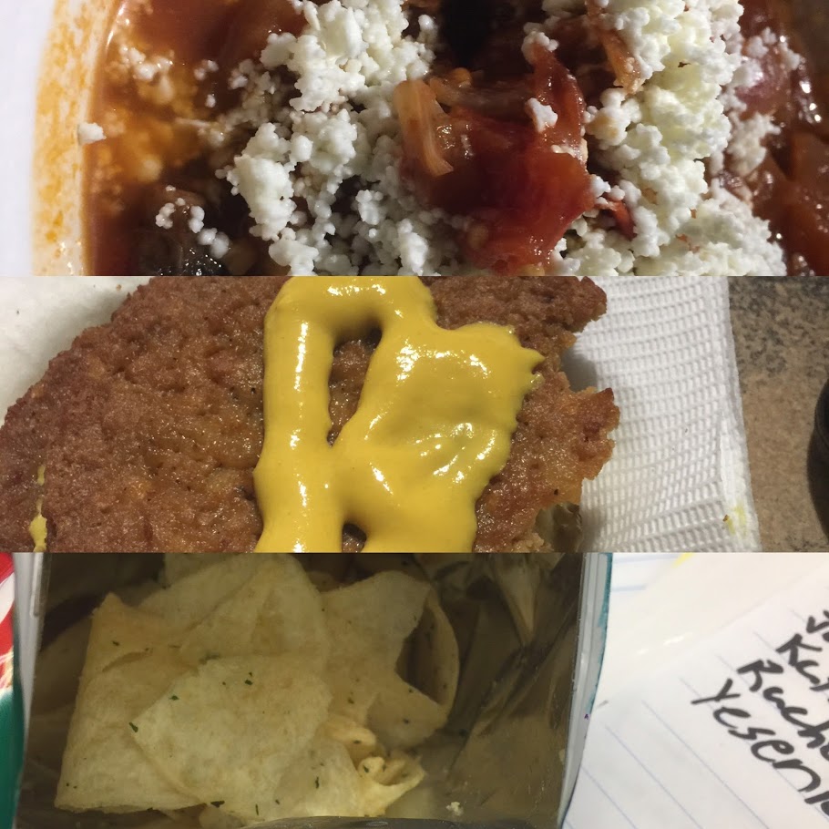 Thursday was another busy day. I took left over Ratatouille to school with. I also snacked on a few sour cream and onion chips. …oops. I still had not gone to the store for real veggie foods, so I had to settle for a veggie burger and mustard for dinner… again.