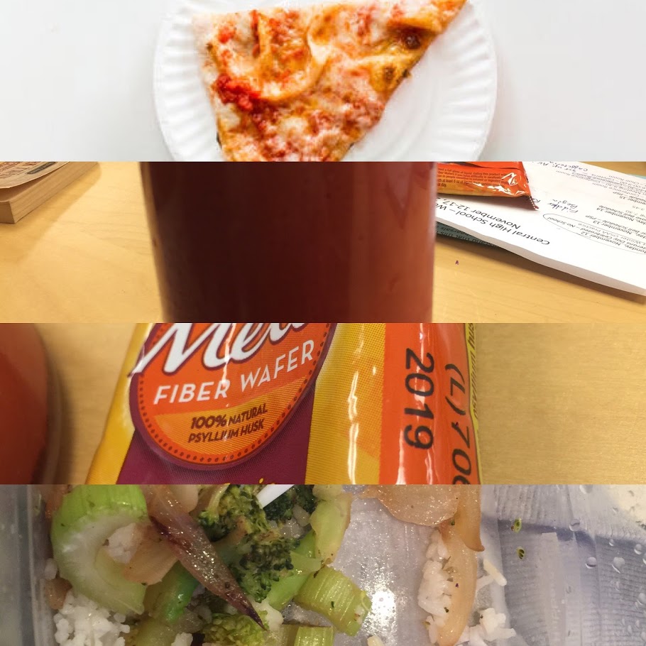 Tuesday that week was a busy day. I had a fruit smoothie and a Metamucil wafer for lunch. I was a long day because we worked at finishing the strike for Mamma Mia. My husband was kind and brought me some veggie stir fry on rice. We got some pizza for the kids that came to help. I ate one piece of cheese pizza.