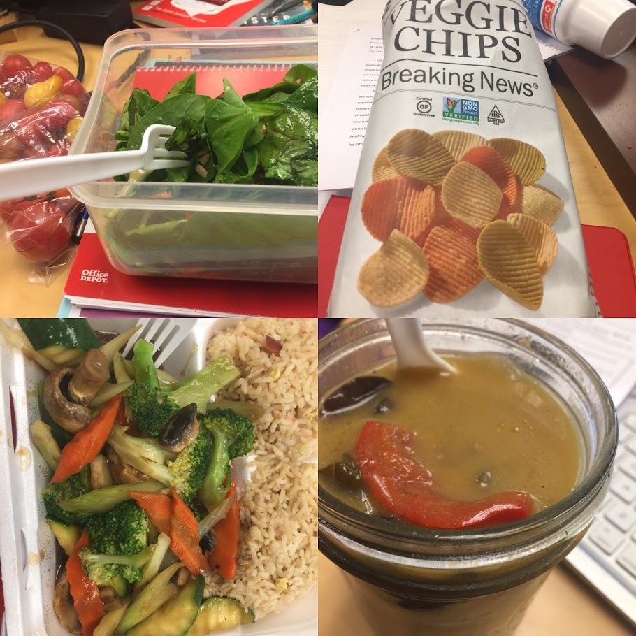 Wednesday I had a salad for lunch with some Miso and veggie soup. I snacked on some veggie chips too. At dinner time my friend got me some stir fried veggies and rice from the local Chinese restaurant because I had to stay late at school for an event.