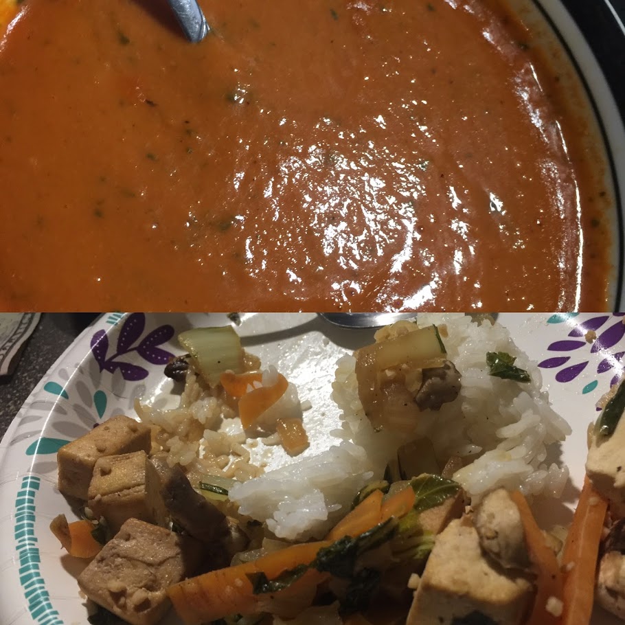 Wednesday was a long day. I ate some leftover tomato and red pepper soup. After a very long day of driving Lilli and her friends around, I came home and had some tofu and veggies and rice that John had made for me.