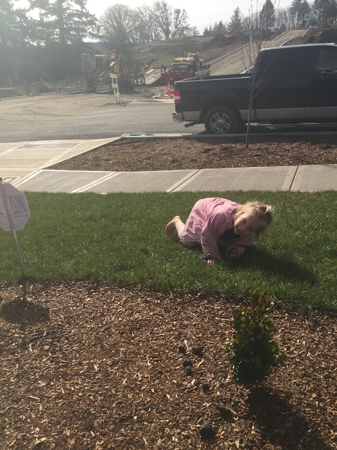 This week I found some time hang out with McKay and the blondies. While I was visiting, we thought the dog got out. We called for him in the house, but didn’t see him. Since he had just discovered how to escape the yard, McKay was very worried he was running around the neighborhood. I stayed at the house and watched the kids play in the front yard (the only yard with some grass and no mud) while McKay drove around looking for the dog. Then, Lenayah rang the doorbell. The dog barked. He had been hiding in the house the whole time! LOL. At least we had some good time watching the trucks outside in the sunshine.