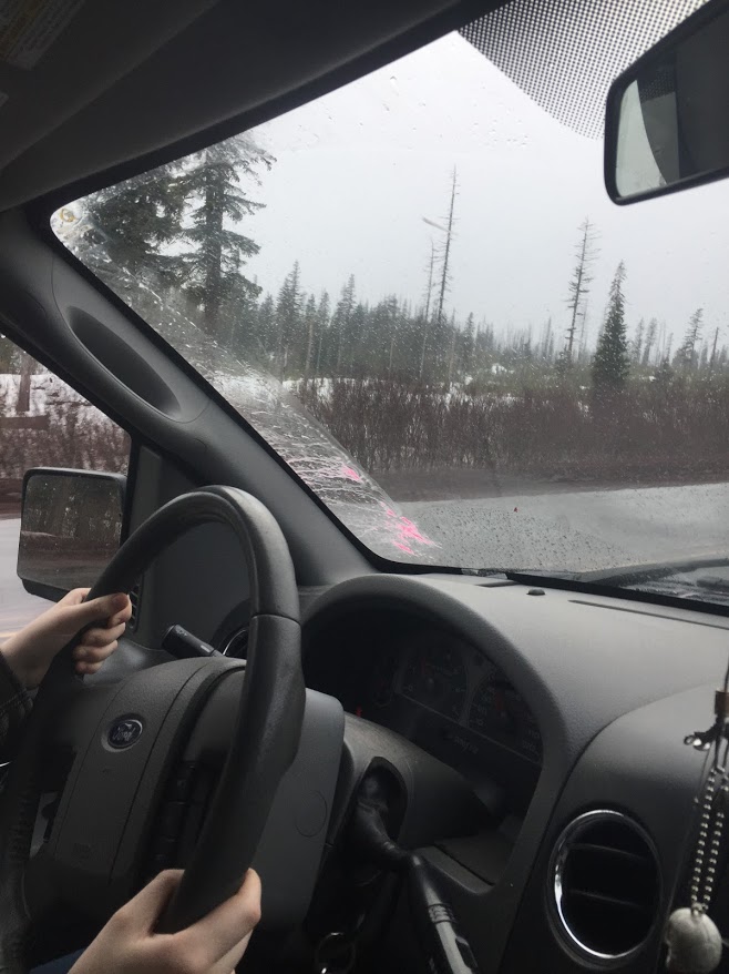 Okay… so we really opened Spring Break the last couple of days of last week, so in a way, Monday was “week 2” of Spring Break. It was jam packed with fun. First, Monday, Lilli and I got up early and drove to Bend. It was a 2-part mission day trip. First, Ethan and his family were vacationing at his family vacation home at Eaglecrest and the two of them really needed to spend some time together. Second, Lilli needed driving time and practice and going to visit grandma and grandpa for the day would easily give her 6 hours. In addition to the driving practice, grandpa was willing to practice parallel parking with Lilli… add another hour! The roads were mostly wet on the way over the mountain. Lilli did a great job navigating through Salem and over the Santiam Pass. The mountains have been blessed with a healthy snow pack. At least the reservoirs will be alright this summer… even if it is hot and dry. Coming home was more eventful. First, it snowed over the top of the pass. It wouldn’t have been so bad it I actually had decent tires and if some loony toon didn’t shoot us with a paint ball! Look real close to one of those pictures. You can see some hot pink in the left corner. A car passed us and SPLAT! Then the windshield wipers spread it around, making it hard to see. That was when the falling snow was handy. It helped to clean the window. We weren’t the only people driving that got shot. It turns out that two teenagers were arrested for shooting people with paint balls from a moving car! People are crazy!