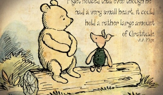 I love this quote. First, what's not to love from Winnie the Pooh and Piglet? Second, I too feel like I have a very small heart, yet I am beginning to notice the gratitude filling it. Today I am grateful for my husband, who although today is his birthday, he is in the other room… Continue reading Developing an Attitude of Gratitude – Day 128