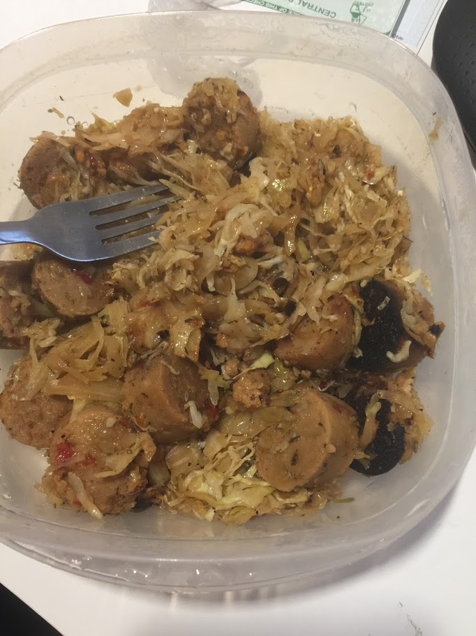 Thursday I was in a grumpy mood. I got up early to go to a meeting that was cancelled. I got to hang out at home a little longer in the morning. But the bad mood led to the choice of eating mashed potatoes for breakfast. I had a cliff bar for lunch. I made some vegan sausage and sauerkraut for dinner.