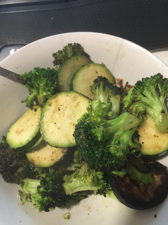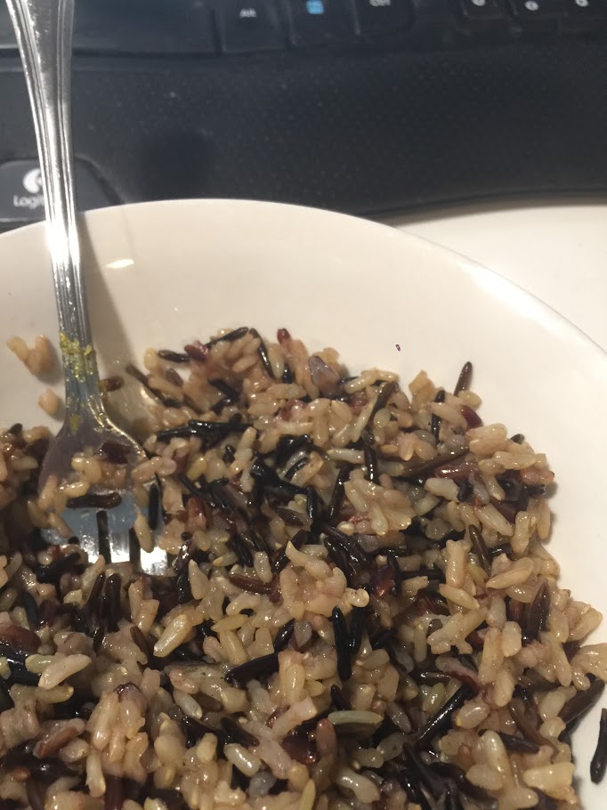 Sunday I didn’t eat breakfast because I got up late for church. When we got home I ate some chips with guacamole and salsa. Later on I ate a piece of our chocolate sugar free fruit cake. I forgot to take a picture. I made the family chicken and rice for dinner. I ate the brown/wild rice mix with a little clarified butter and grilled zucchini and broccoli for dinner.