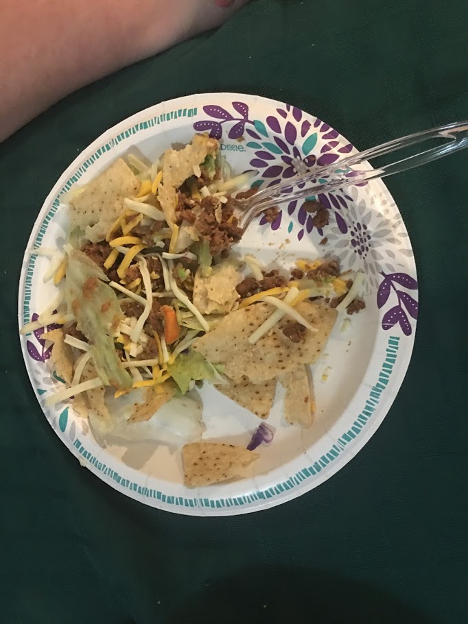 Sunday was a family eating day. There was no time for breakfast before church. For lunch I had tomato soup and a grill cheese sandwich. We had the family over for dinner. We made taco salad. John found some kind of veggie burger that was pretty good for my salad.