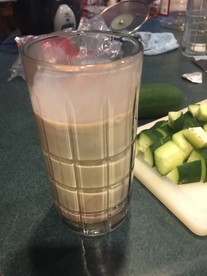 I am finding it very hard to pack foods I can eat at work. Most work days I can’t just sit and eat. I need to eat something on the go. Monday I ate left over wild rice and veggies, topped with an egg for breakfast. For lunch I ate a protein bar and the crust of a piece of pizza that my daughter handed me. When I got home I was super hungry… I started making dinner and enjoyed a glass of half almond chocolate milk and half eggnog. I ate cucumber tofu with some cabbage in it for good measure for dinner.