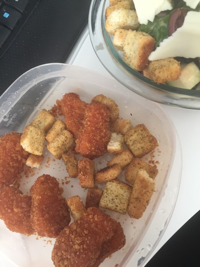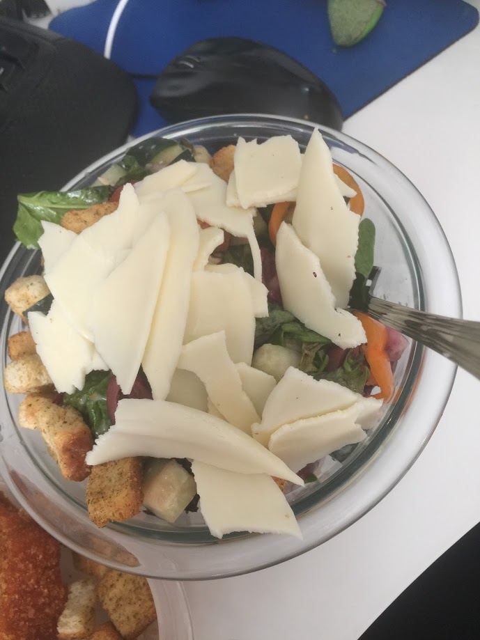 Today I am grateful for a successful day of 23:1 intermittent fasting. I am also grateful for the hard boiled egg, the yummy Greek salad with provolone cheese, veggie chicken bites, and lemon water.