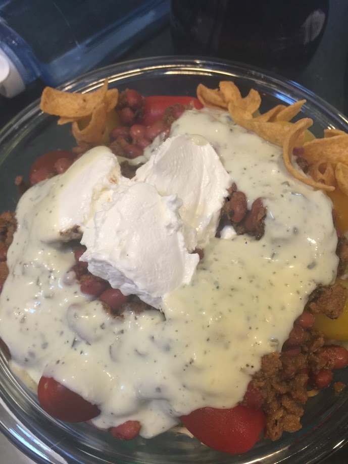 Today I am grateful for the Provolone cheese, a taco salad made with lettuce, cherry tomatoes, cheddar cheese, bell peppers, red onions, veggie taco meat, red beans, sour cream and avocado cilantro dressings. I shouldn’t have added them, but I am grateful for the 10 Frittos I added to the salad. And, I am grateful for the blueberries and cream I enjoyed for desert.