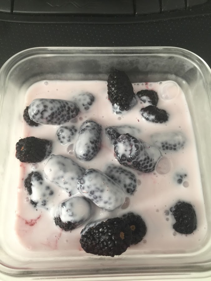 Today I am grateful for left overs. I really need to learn how to make smaller amounts of food when I cook. When I eat for only an hour a day, I can’t eat the food I make and Lilli won’t eat left overs and John rarely eats them. I hate seeing food wasted, so I end up eating it when I didn’t really want to… But today I was tired and didn’t want to cook and it was nice to have a quick meal. So today I eat left over broccoli, cauliflower, beet greens and cheese sauce. I had a bowl of left over curried lentils. And as a desert I enjoyed blackberries smothered in blueberry kefir.