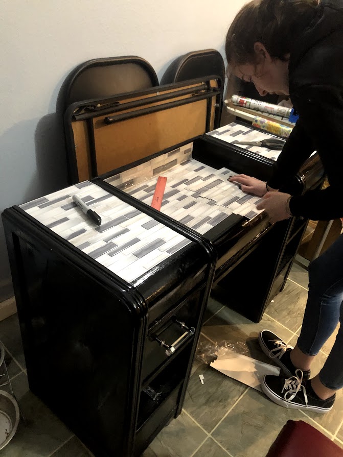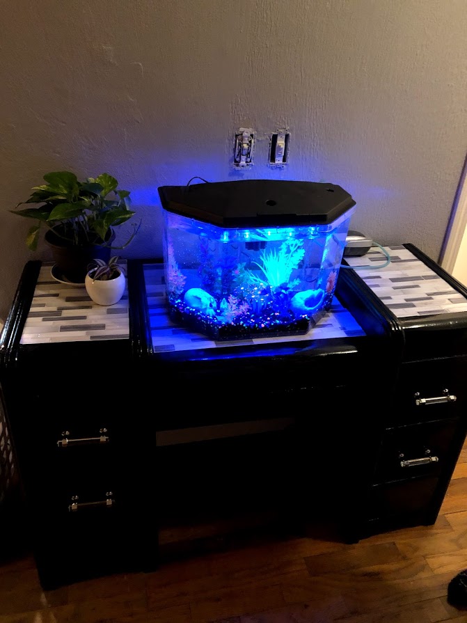 Today I am grateful for projects that are turning out awesome! I love how the refinished job on my fish tank holder turned out. Today I am thankful for Lilli’s help on the project sticking the tiles on the desk I sanded, repaired and painted and for John’s help who drilled holes for the new handles on the drawers.