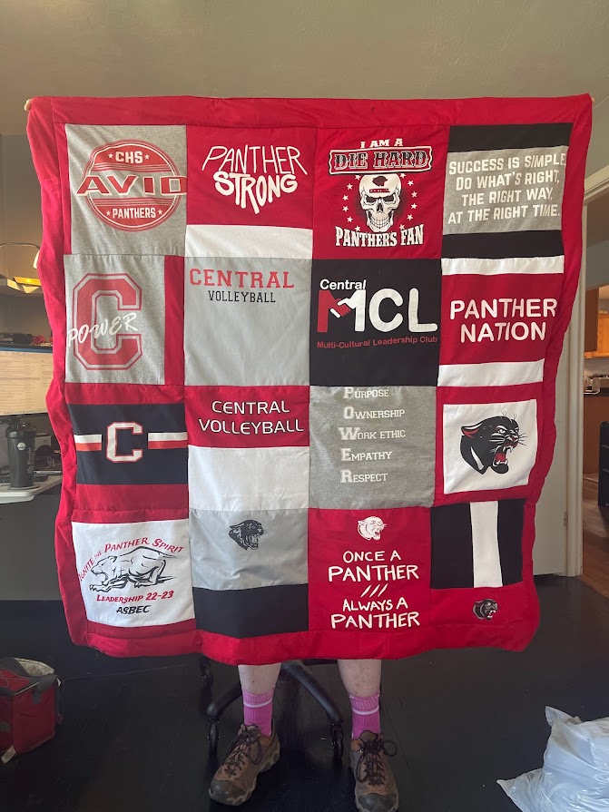 I made this t-shirt quilt for my friend’s daughter… first time I ever made a t-shirt quilt. I decided to use featherweight fusible interfacing so I could cut straighter lines and and keep the t-shirts from stretching. I also tried “quilting” on a machine for this project rather than “tying” the quilt. I feel pretty good about it. My only mistake is that I missed stretching and flattening the back on one run of the “stitch-in-the-ditch” process so it puckers in one spot. (and John’s socks?).