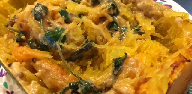 I love how this dish turned out! I grow spaghetti squash and it is nice to have a fun way to prepare it. Ingredients 1 medium spaghetti squash 3 Tbs garlic, minced 6 oz fresh spinach 1/2 c coconut cream 1 Tbs vegan cream cheese 1/2 c vegan mozzarella cheese Directions Preheat oven to 400… Continue reading “Cheesy” Garlic Spinach Spaghetti Squash