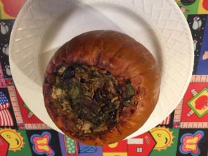 Vegetarian Dinner in a Pumpkin - Vegetarian Dinner in a Pumpkin 4 servings Prep time: 30 minutes Cook time: 1 hour 15 minutes Ingredients 1 medium pumpkin 2 c cooked wild rice pilaf 1 onion, finely chopped 3 cloves garlic 1 pck sliced mushrooms 1/2 c walnuts 1/2 c dried cranberries 2 c spinach, chopped 1 tsp… Continue reading Vegetarian Dinner in a Pumpkin