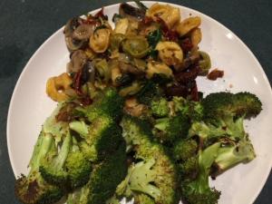 Spinach and Sun-dried Tomatoes and Tortellini with Roasted Broccoli - Ingredients 1 pkg sliced mushrooms 1 onion, chopped 2 cloves garlic, minced 1 jar sun dried tomatoes 1 pkg tortellini 8 oz fresh baby spinach