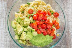 Avocado Pasta with Spinach and Corn - Ingredients 1 c frozen corn 1 pint cherry tomatoes 2 T olive oil 8 oz whole-grain pasta 2 c baby spinach 1 avocado, pitted and chopped 1 1/2 T fresh lemon juice 1/4 c pumpkin seeds Directions Toss corn, tomatoes and 1 T olive oil on a cookie sheet. Bake for 15 minutes or until… Continue reading Avocado Pasta with Spinach and Corn